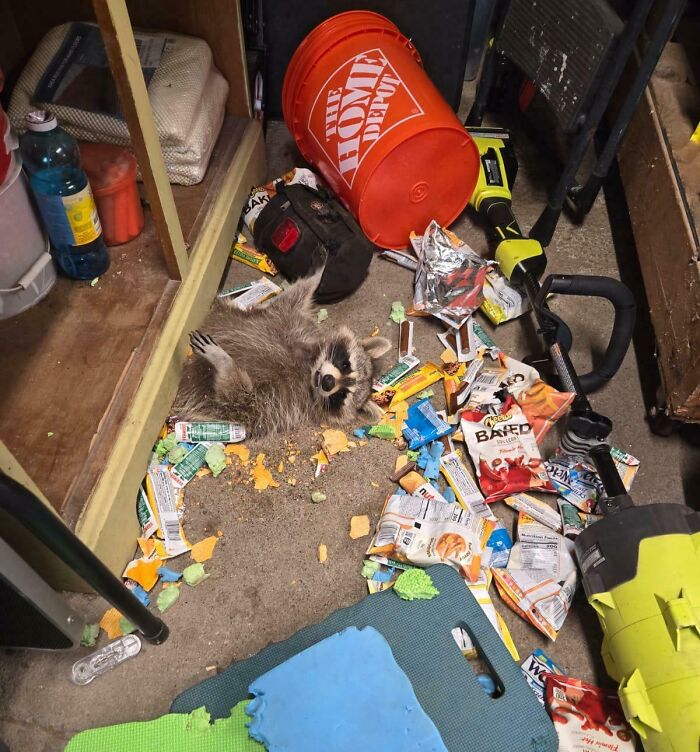 #28 Raccoon Broke Into My Brother’s Garage, Ate A Ton Of Snacks, And In The Process Became So Fat He Got Stuck Under A Bureau