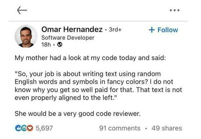 “Programmers often have a rich sense of humour that’s often related to their line of work. Their jokes might be technical, but they’re definitely there and can be quite witty. Because programmers’ humour is quite technical and full of industry jargon, a lot of people don’t understand it, and that leads to them believing that we don’t have a sense of humour.”