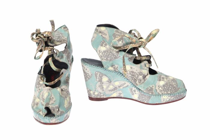 #81 Rare Pair Of Wedges In Butterfly-Printed Sky-Blue Silk By Léandre, Circa 1947