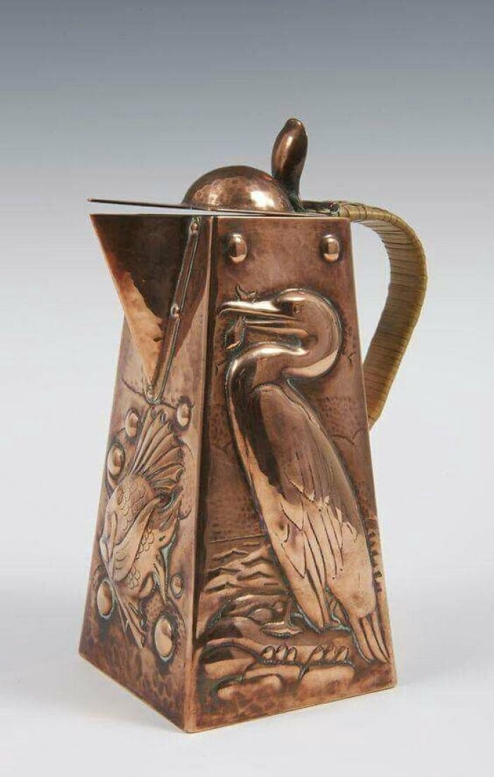 #88 An Arts & Crafts Newlyn School Copper Water Jug, Embossed With Cormorant And Fish, Wicker Handle