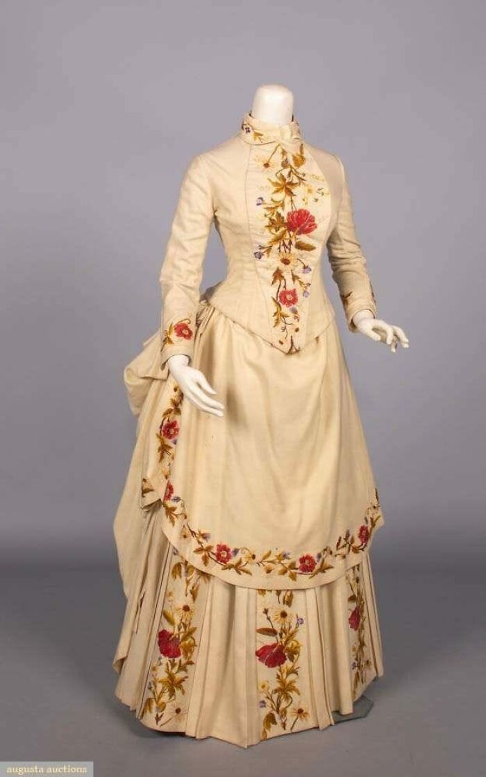 2-pc cream twill wool flannel day dress hand embroidered with satin stitch floral motifs in wool & silk to convertible collar, center front & back of fitted bodice, cuffs, front of integrated apron overskirt & in vertical bands at skirt front, bodice. -Augusta Auctions