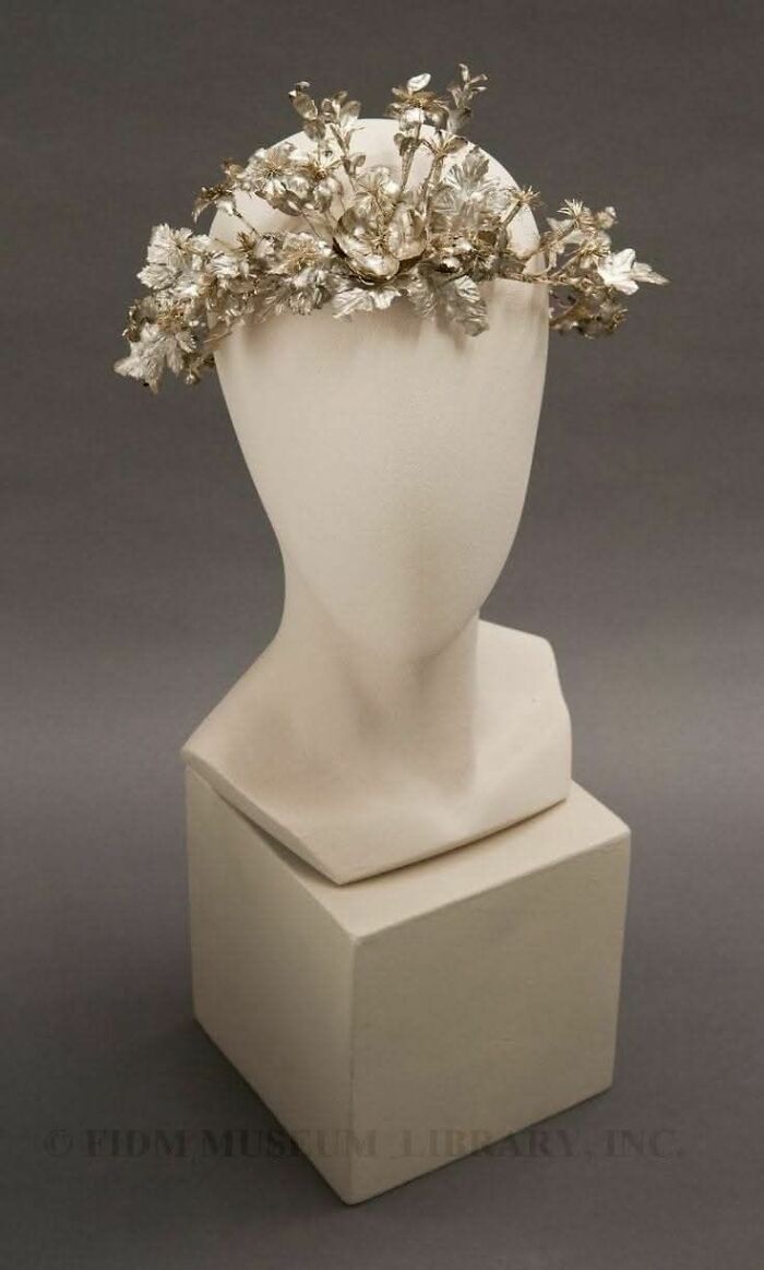 Delicate headdresses made of jewels, ribbons and real or artificial flowers and leaves were popular in the late 1850s and early 1860s. These were worn primarily for evening or formal dress, and often matched or complemented motifs seen on the dress itself. Whether incorporating roses, ribbons or the oak leaves seen here, this style is a clear reference to the crowns seen on ancient Greek and Roman statuary. In both ancient Greece and Rome, wreaths of flowers or leaves were awarded to Olympic athletes, military commanders and supreme rulers. Oak leaves and acorns have a particular significance, as they were sacred to the Greek god Zeus and his Roman equivalent, Jupiter.
