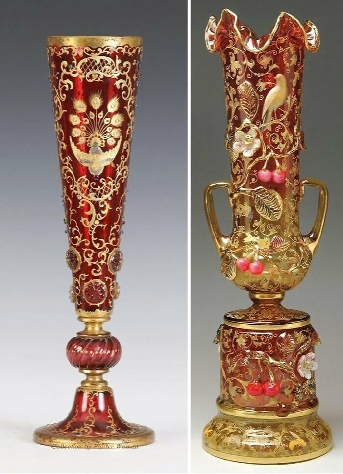 #45 Two Antique Moser Cranberry Glass Vases Featuring Intricate Gilt And Enamel Decoration