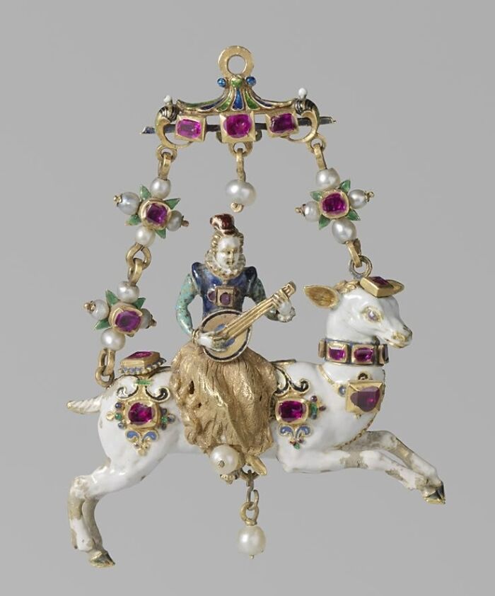 #48 Pendant, Lute Player On A White Dear, Germany, CA.1600. Gold, Enamel, Pearls And Rubies