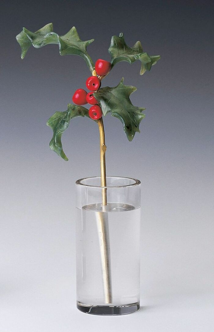 A holly sprig with five berries carved in purpurine, four leaves of highly polished dark nephrite, all attached to a stalk of dull green gold in a cylindrical rock crystal pot.
