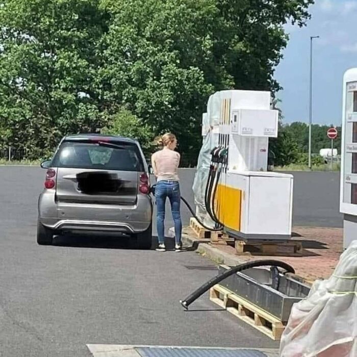 She pumped gas for 3 minutes without realizing the pump was still on a pallet