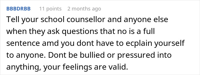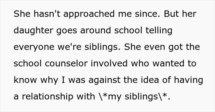 However, things got complicated when his father’s stepdaughter suddenly demanded that he bond with her and their half-siblings. Our guy was taken aback, but made it clear that he was not interested. Much to his dismay, it didn’t stop there, as she started telling everyone in school that they were related. Even his school counselor inquired why he didn’t want to bond with his “siblings.”