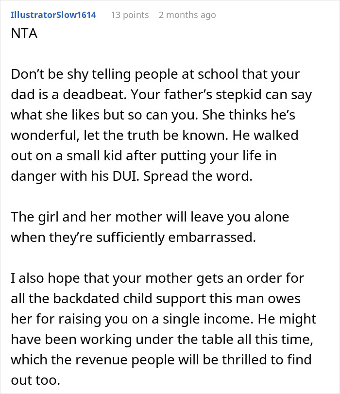 He also didn’t pay child support, and the poor poster was pained by his father’s behavior. In fact, he had to go to therapy just to get past the hurt, until one day, he stopped caring about it. Life moved on for them, and his dad ended up being a stepdad to his wife’s daughter, and they also had two kids together, but OP didn’t care about any of them.