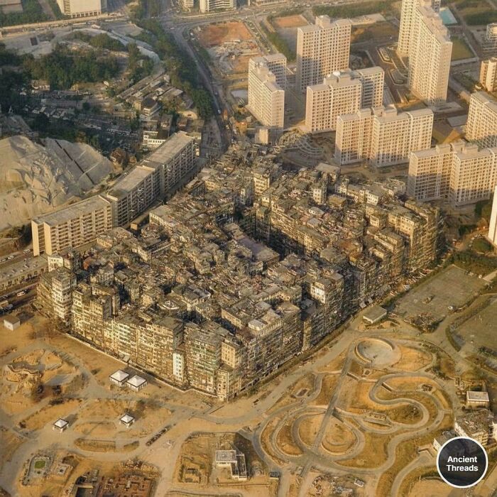 #108 An Aerial Photo Of The Kowloon Walled City, Hong Kong Taken In 1989. The Walled City Contained 50,000 Residents Within Its 2.6-Hectare (6.4-Acre) Borders. It Was Demolished In 1994
