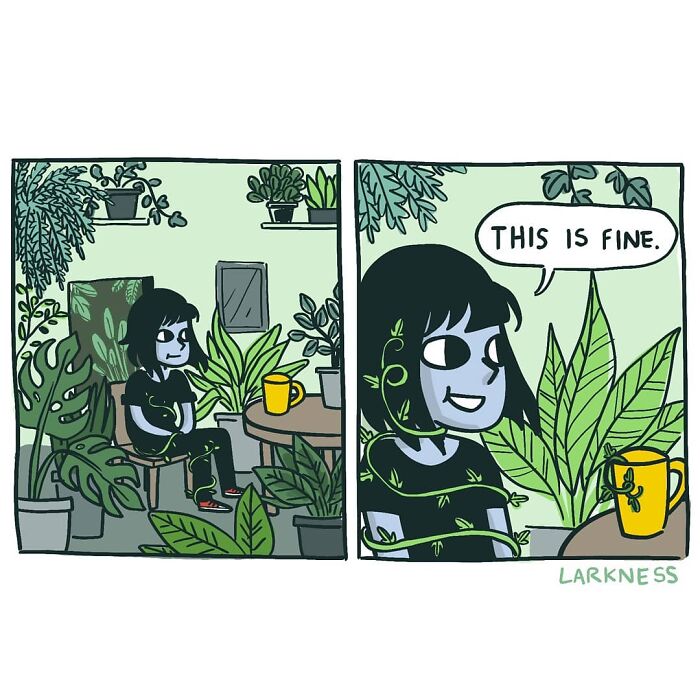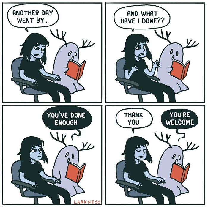 The age of classical comics confined to newspapers or little books is over, and the medium has exploded into many shapes and forms done by thousands of artists in their own special way. The newspaper cartoon has been replaced by a daily dose of a comic viewed through social media. The themes have also changed: instead of often tacky gags or some political commentary, most comic artists nowadays choose more down-to-earth and relatable topics like everyday life and inner struggles. Lark, or Larkness (Estela Ribeiro Kuntz), the hero of today’s post, is one of those newer types of comic artist and even though she’s never been published in a newspaper, her comics are enjoyed by thousands on the internet.