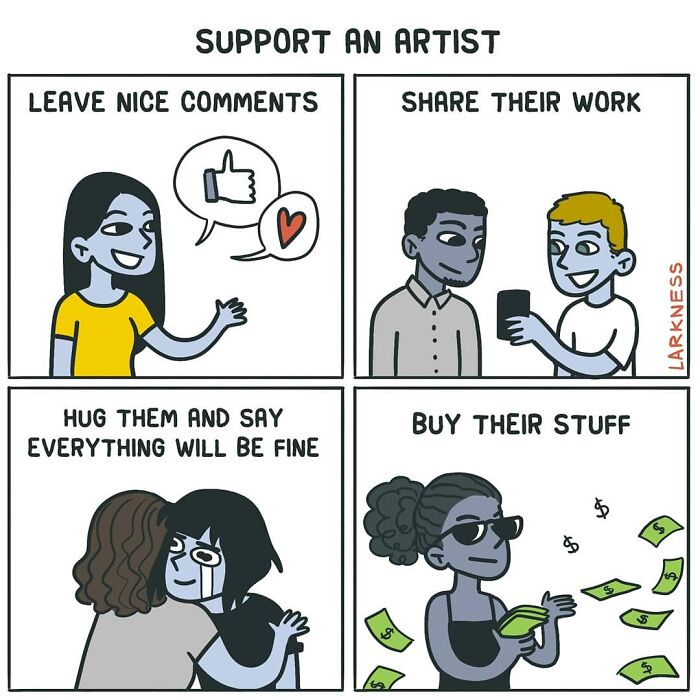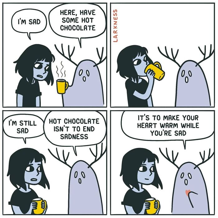 Larkness’ comics are well-appreciated on Instagram and Facebook, and she has over 120k combined followers across the platforms. She’s been a favorite of our readers, too. You can find a post done by none other than herself here. If you want to support her, there’s a comic made by Larkness that explains just how to do so. If you’re a Brazilian reader, you might be interested in her comic book called “How to deal with your ghosts.” And also, as always, make sure you follow her on social media as that’s one of the main ways to make it big in the comic world. Cheers!