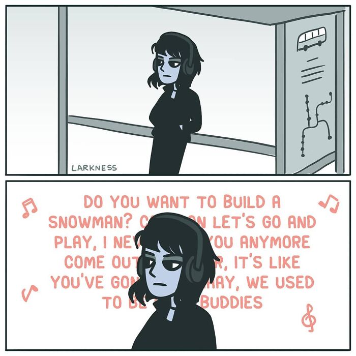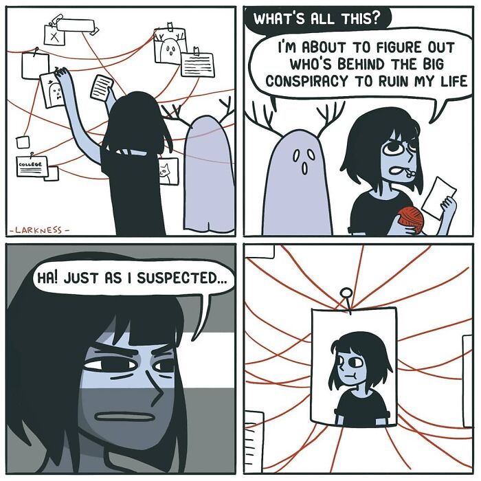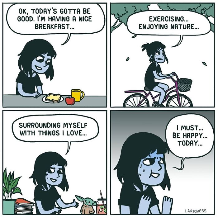 Larkness’ comics embrace the dread of everyday life, the ups and downs, and all of the little moments in between. Lark, the main character, doesn’t try to act as if she’s in control of her life—sometimes her inner demons get the best of her; sometimes Lark wallows in self-pity, and there’s many opportunities for her to have a laugh at her own expense. But it’s not a bad thing. Human flaws are not just part of her comics, it’s what makes them interesting, authentic, and relatable. And this is why I love them so much and find them endearing.