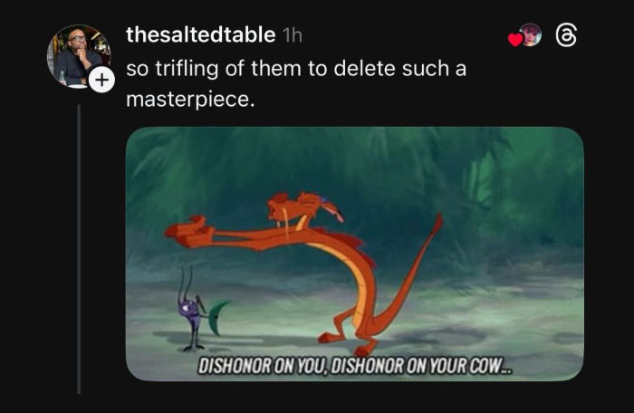 Even now that the thread has been deleted, people can still go to Disney’s Threads account and find people addressing the situation. The top comments with over two thousand “likes” are all in the vein of continuing the discussion. “Never dirty delete,” user @thatladyfromrichmond wrote, accompanied by a GIF from the 1998 Mulan. “Shame on you, Disney. You know better, because you taught us better,” another user, @artemislynne, wrote.