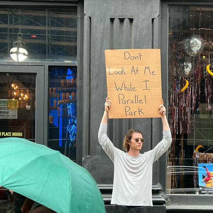 Living in New York City can be overwhelming for anyone, so silent protests might sometimes be the best way to get a message across. There are millions of people moving about the city at all times, and very few people will stop and talk to a stranger. But if Dude With Sign is standing on a corner or outside Starbucks sharing whatever is on his mind, he can somehow grab people’s attention. Seth’s Dude With Sign project is genius because he’s not bothering anyone or causing a scene, but with his blank expression and sunglasses, he still sends a powerful message. (Even if that message is just a complaint about people watching him parallel park.)