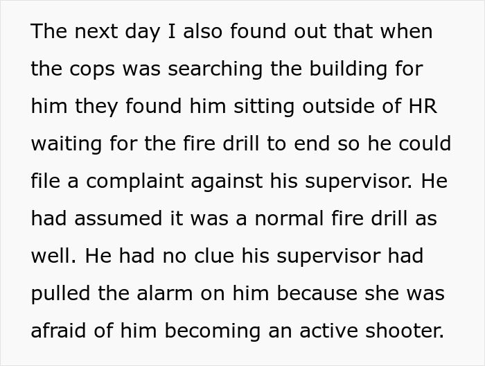 Carl, on the other hand, proved that his employer was correct to fire him based on his own reaction to the news. This is not normally a good reason for termination, but cases like this are good reminders of why on-site security exists. If there was dedicated security, the fire alarm would not have been needed, probably limiting the chaos to just the poor manager’s office. Obviously, not a great situation for her, but at least the rest of the workforce wouldn’t have been disrupted.
