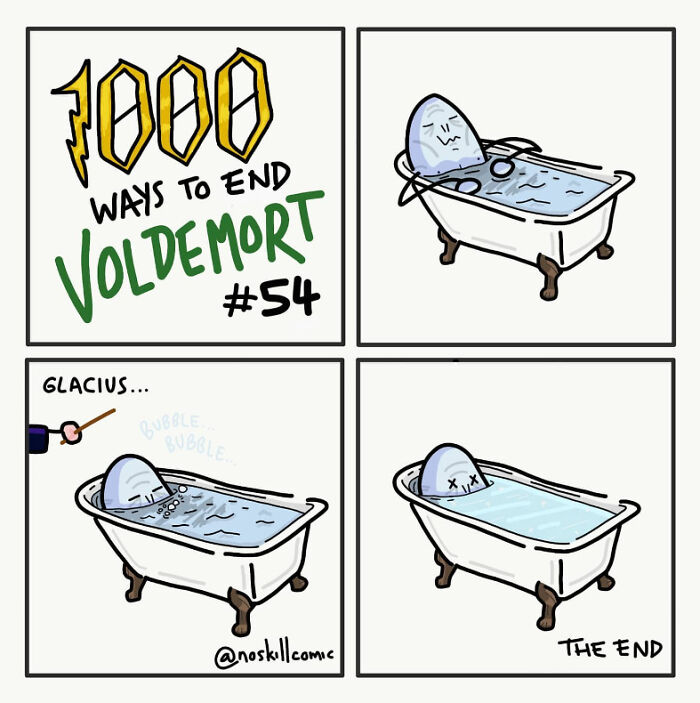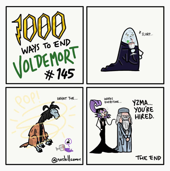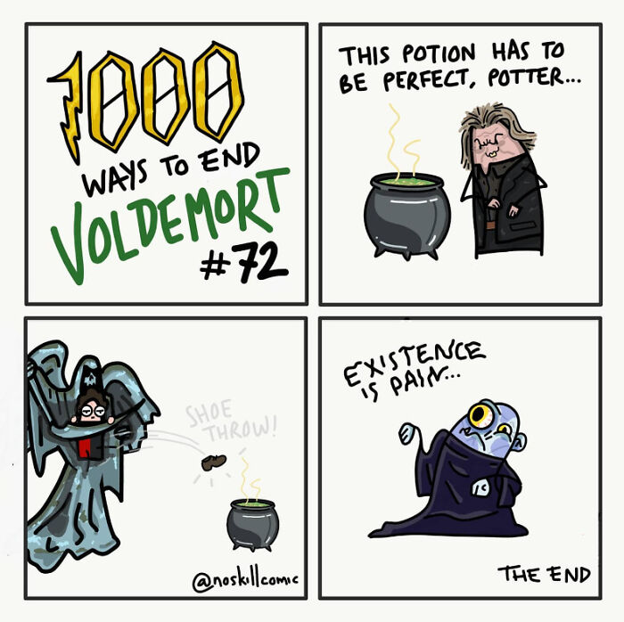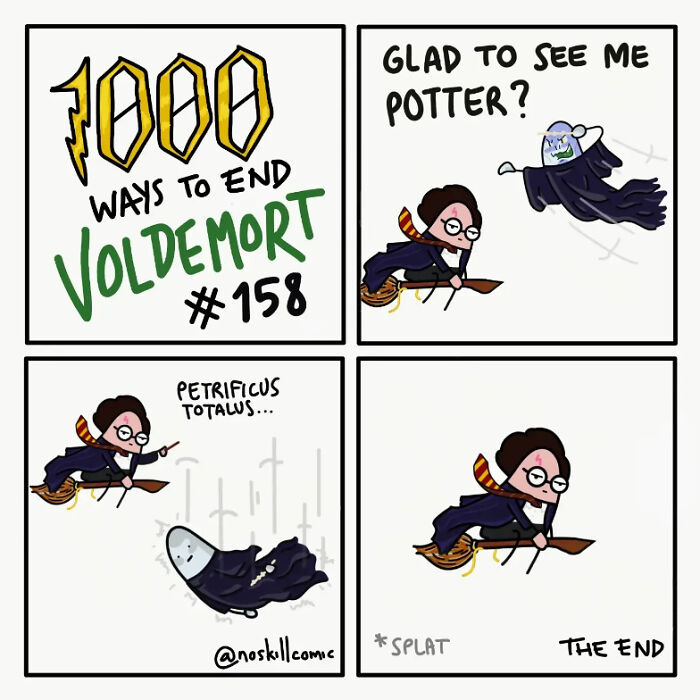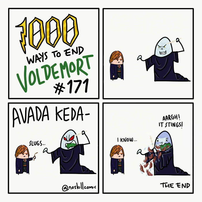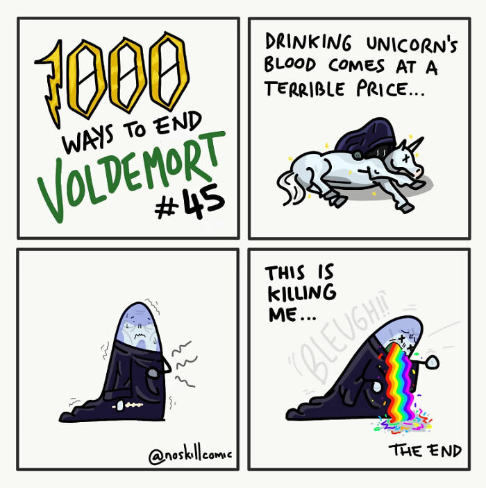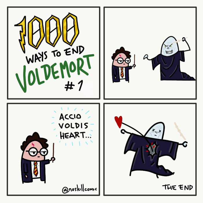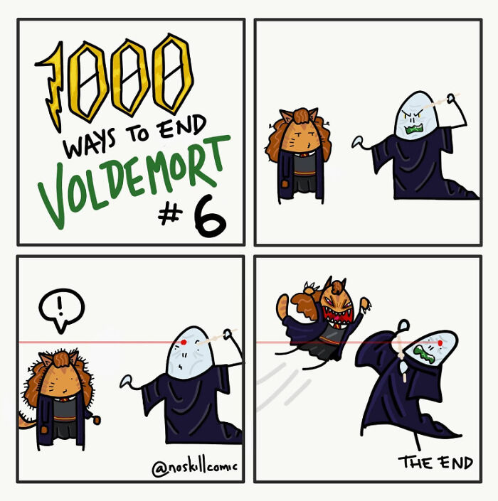 When I’m drawing, I pick something from my notes and think of a funny (and nearly always stupid) way to use it to defeat Voldemort. When you’re not focused on being lore-accurate, it gets easier. Also, people send me DMs with their ideas, and that helps, too.