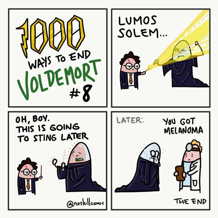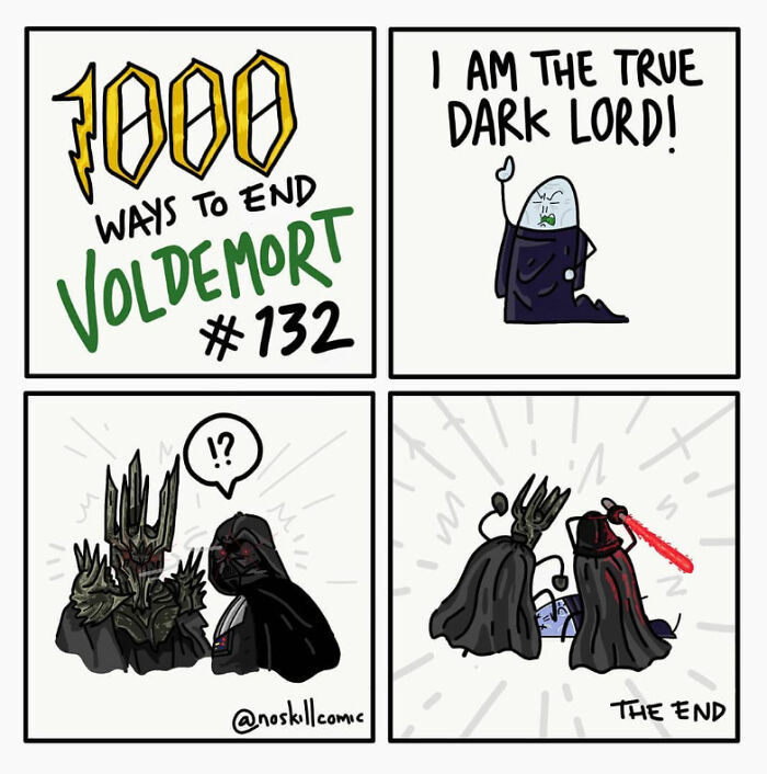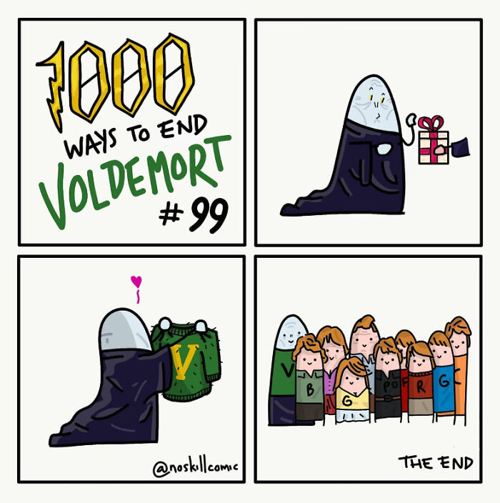 I’ve created over 170 comics so far (you can see them all on my Instagram) and have many ideas for the remaining 830 ways to end you-know-who. I hope you enjoy, laugh, and don’t complain too much about the absolute lore inaccuracies of some of the jokes.