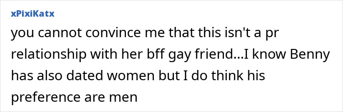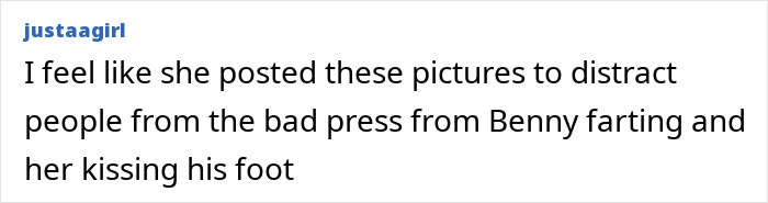 “I feel like she posted these pictures to distract people from the bad press from Benny farting and her kissing his foot,” one commented online