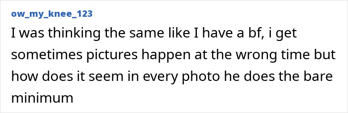 “I was thinking the same like I have a bf, i get sometimes pictures happen at the wrong time but how does it seem in every photo he does the bare minimum,” wrote another.