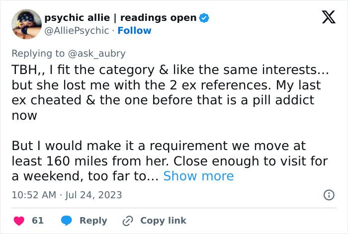Of course, in most cases, this term had a pretty pejorative meaning, both annoying and embarrassing to the children and exhausting to deal with for educators. The mother in this post calling herself one without a hint of irony is a burning, bright red flag for anyone potentially involved. Even if a woman (although that is just the son’s preference) was interested in this offer, it would mean dealing with an aggressively involved mother, a herculean task for anyone.