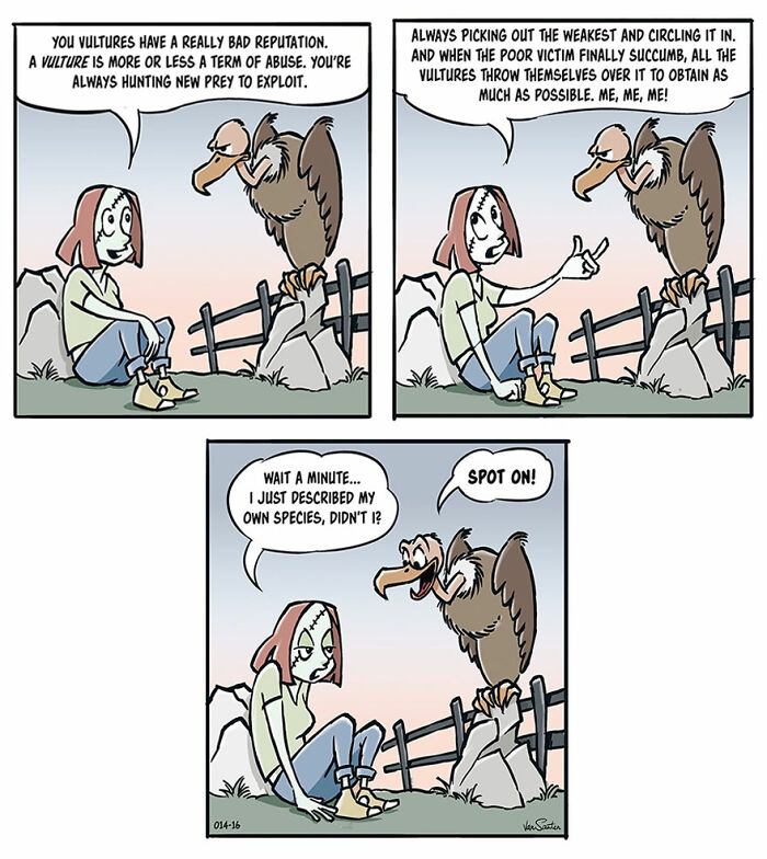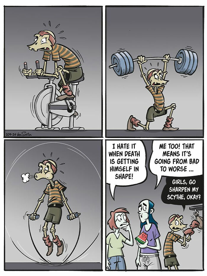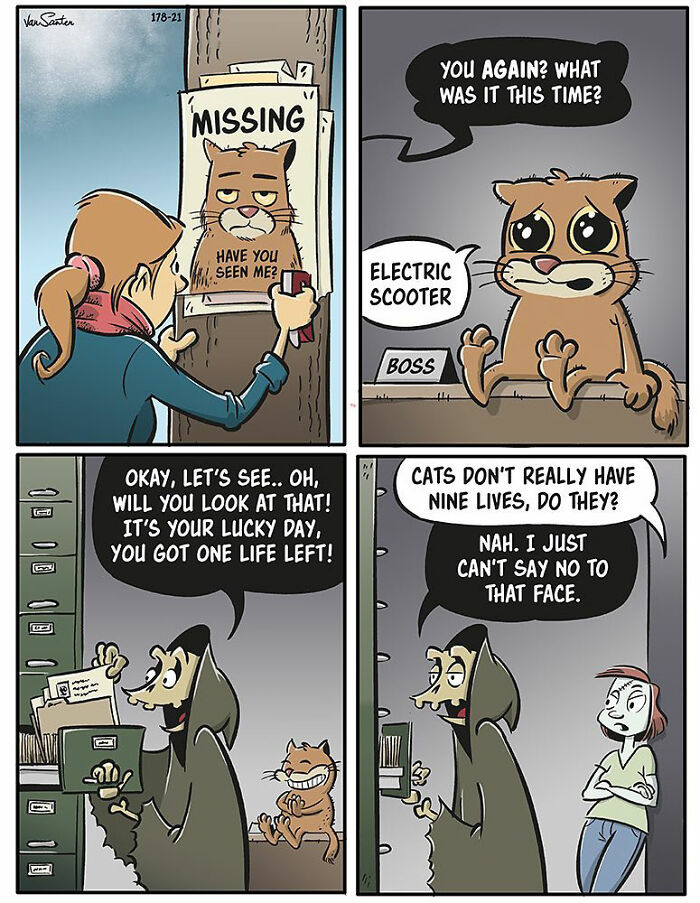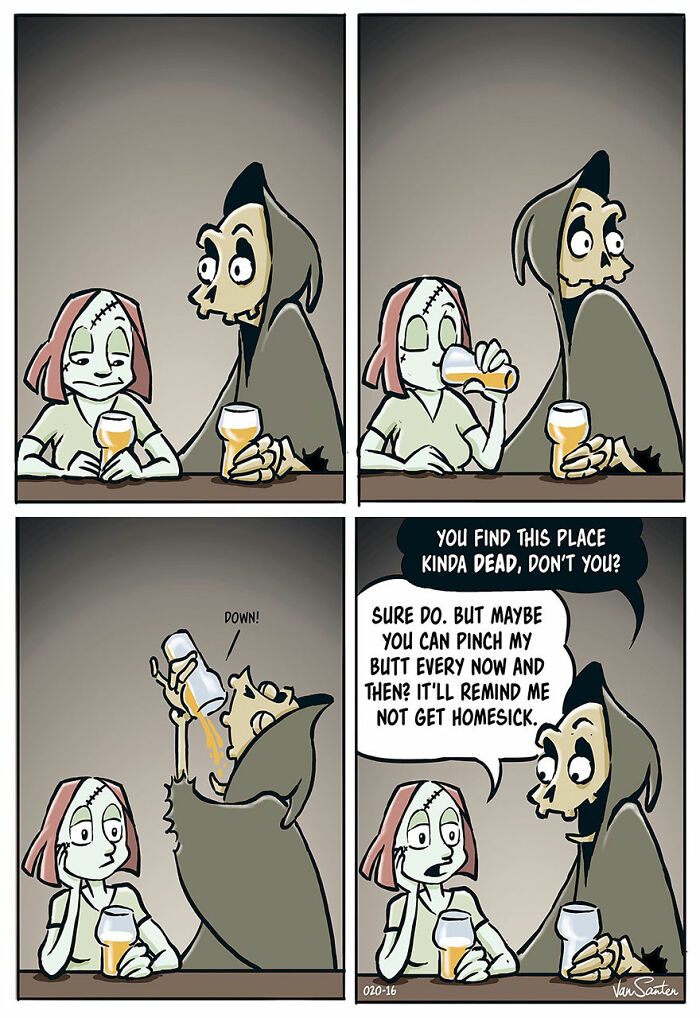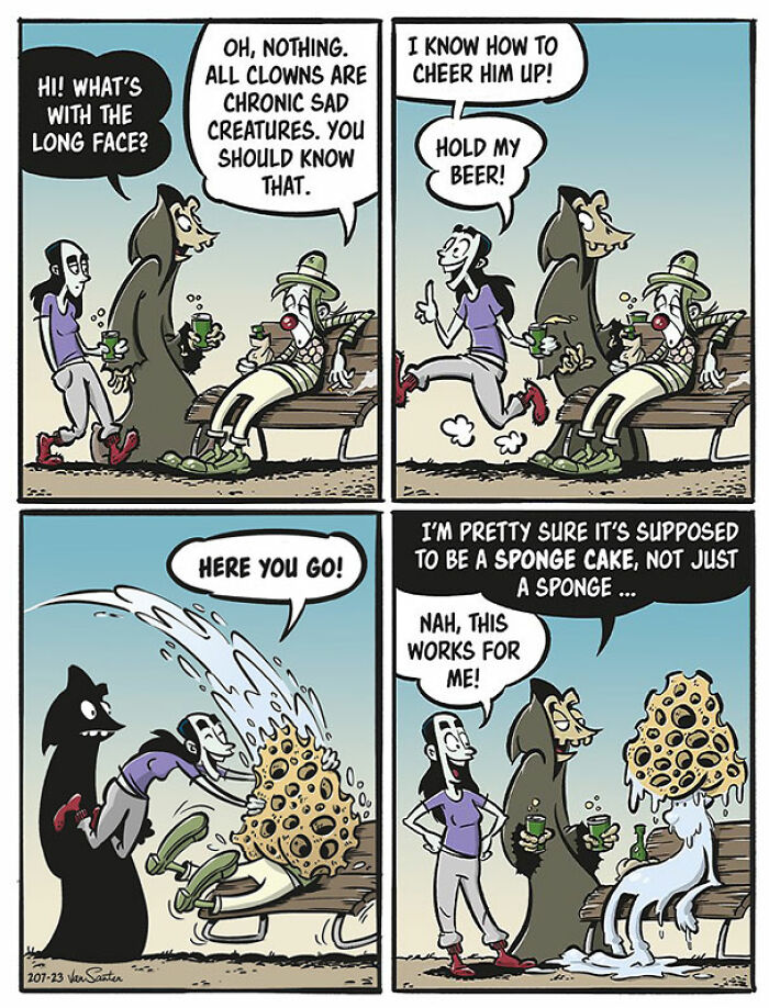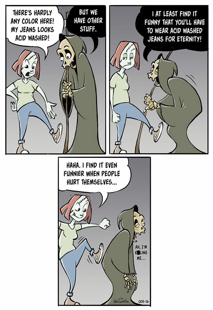 Bored Panda wanted to learn more about the series, so we reached out to its creator with a few new interview questions. This time, Jorgen shared more about the main characters featured in his comic: “My inspiration for turning the Grim Reaper into a funny and friendly (but actually not very empathetic, if you look closely) character is simply my sometimes overwhelming fear of death which has haunted me since I was a kid. Being a nonbeliever with no expectancy of going to heaven or h**l, I find comfort in creating my own afterlife populated with interesting creatures. In this afterlife, existence is bleak but uncomplicated, which I can appreciate. Also, animals talk. Yay!”