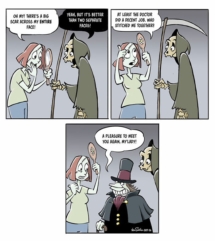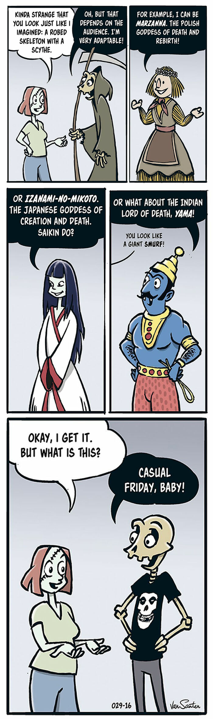 We were curious whether Van Santen has ever received messages from people who found comfort in his comics while dealing with loss. Here’s what we found out: “I have received lots of messages from a great deal of people, but not people dealing with loss. I have, however, been contacted by someone who found my version of the afterlife so much more interesting than her own life, that she wanted to die. That was upsetting and sad. But mostly I get messages from people who want to say that they enjoy the comic and tell me to keep up the good work (as long as they don’t have to pay). Or they want to collaborate on promoting pet food, jewelry, or other super relevant stuff. Oh, and this one guy who wanted to know the Maidens bra size.”