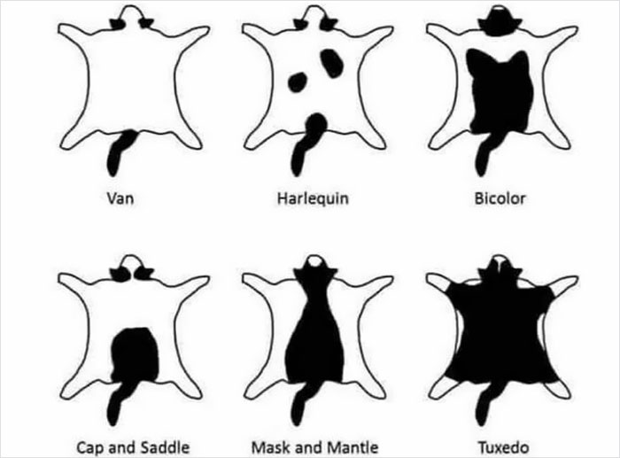 “A cool guide showing you the various patterns of black and white or tuxedo cats”