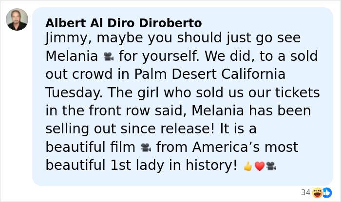 Referring to reports about the film’s demographic, he quipped, “Imagine those poor senior citizens. Good morning, Mrs. Greenwald. Here are your heart pills and here are your liver pills. And here’s a pair of tickets to Melania.
