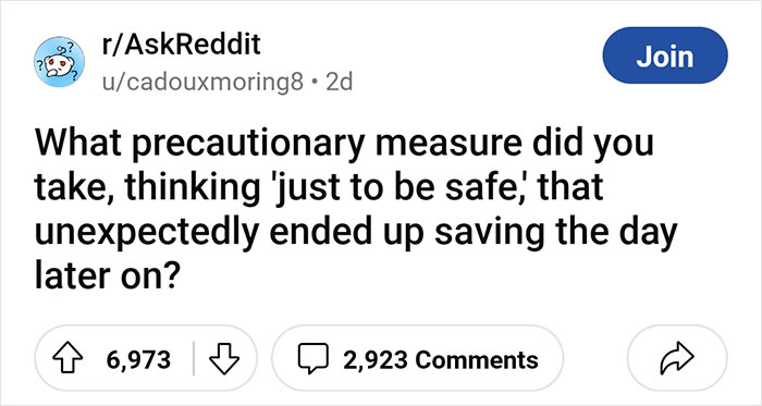 One netizen was curious if other people had ever had such an experience. “What precautionary measure did you take, thinking ‘just to be safe,’ that unexpectedly ended up saving the day later on?” the Redditor asked. And the people delivered with all sorts of answers. From saving themselves from snow storms, taking out insurance just in time, or preventing car theft – check out the answers and upvote the ones you find the most riveting.