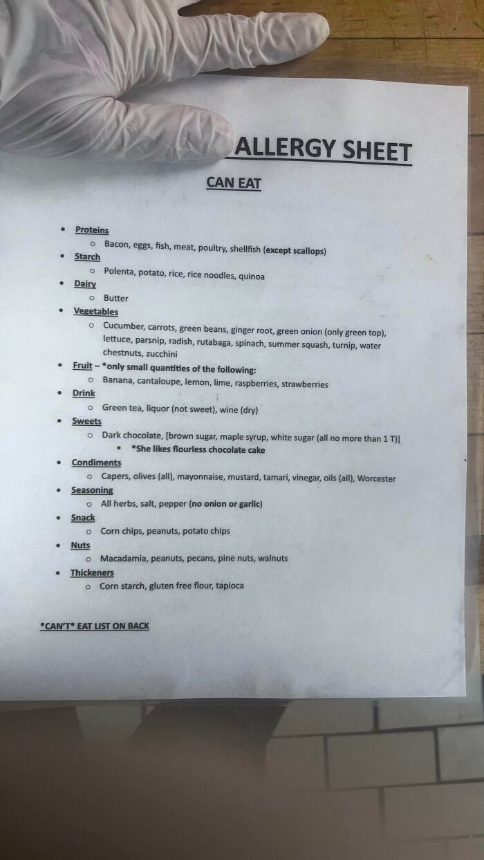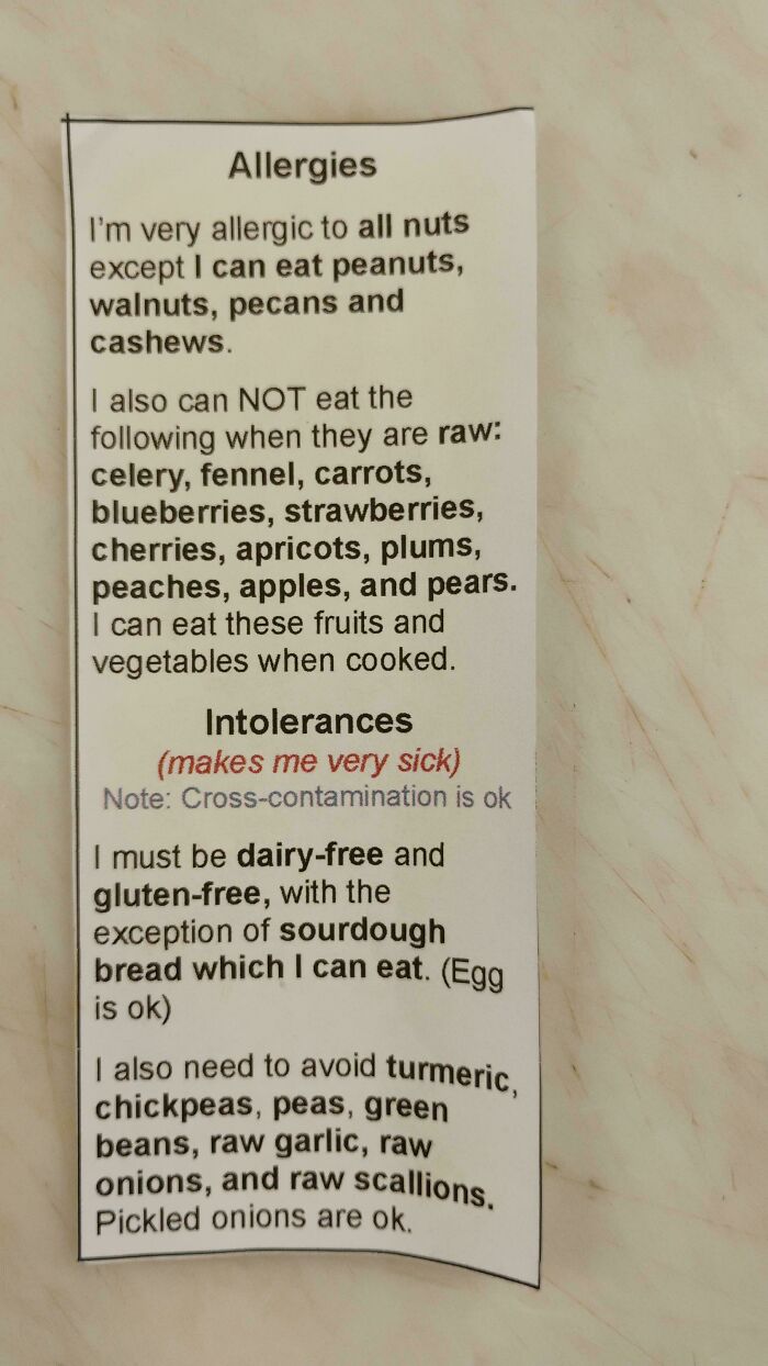 #23 This Is Insane I Just Got Handed A Laminated Allergy Sheet For 1 Single Person