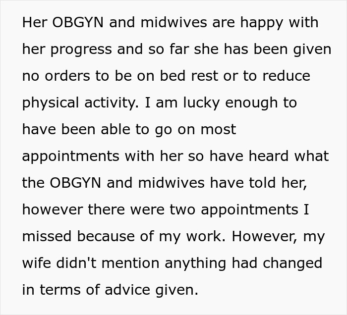 The husband also explained that the pregnancy was not high-risk and no special precautions were needed, as said by their doctors