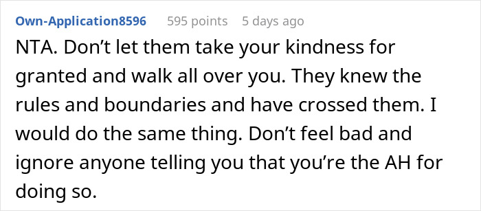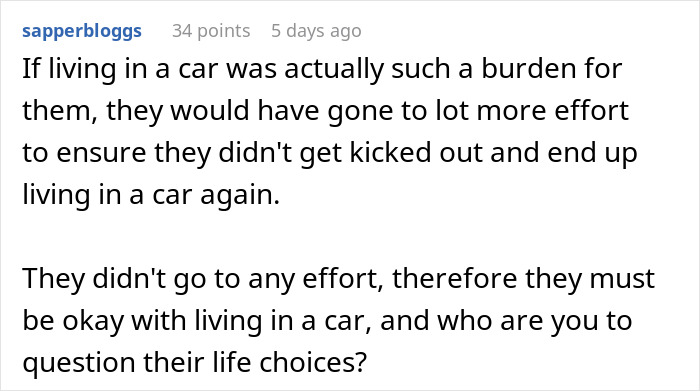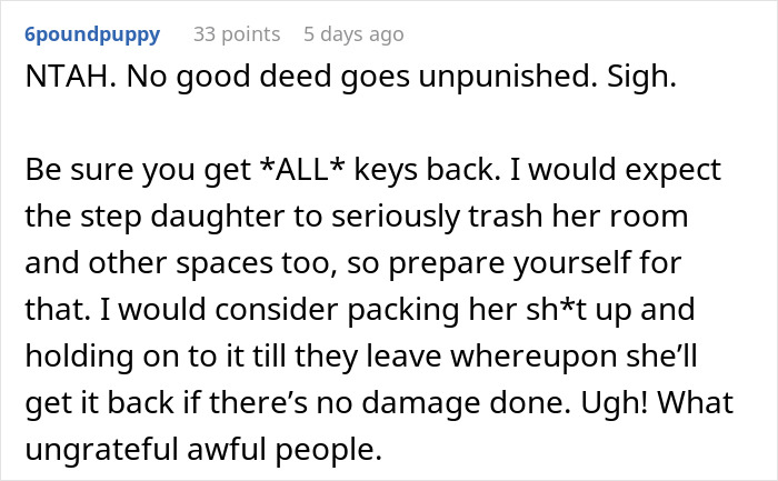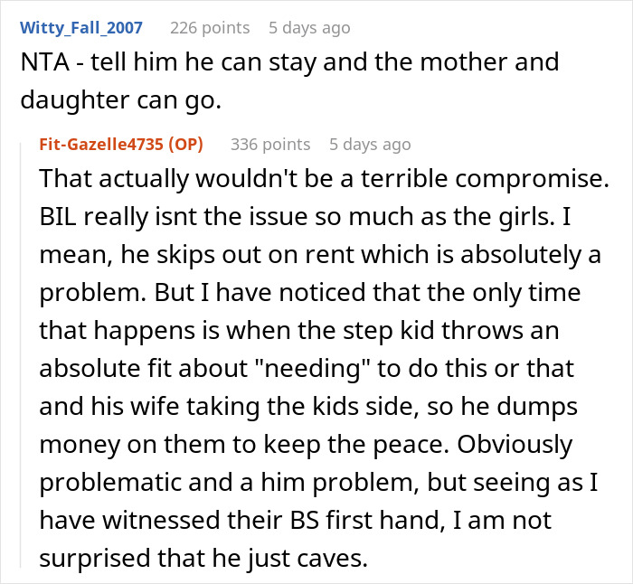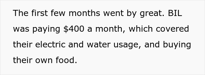 Not only did the BIL stop paying towards electricity, food and water, but his teenage stepdaughter turned the house into a pig-sty. Dirty dishes in bedrooms, fake nails and eyelashes everywhere and a nasty bug infestation to boot. The woman says she’s subsequently told the family to leave, despite knowing they’ll be forced to sleep in their car.