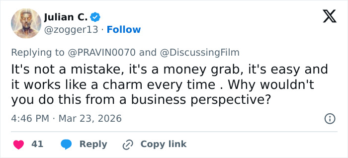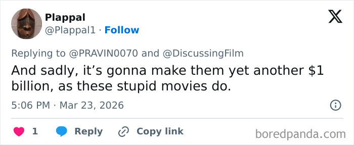 “Sadly its gonna make them yet another $1 billion, as these stupid movies do,” a netizen said about the upcoming film