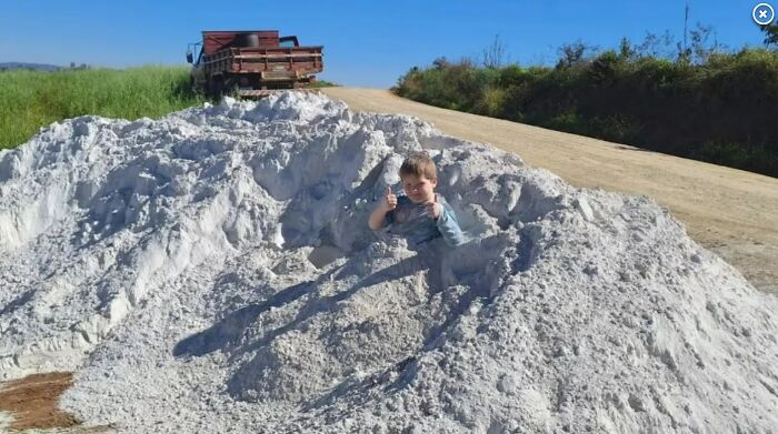 The boy jumped into a pile of limestone on the side of the road. Shortly after his father took this photo, Arthur collapsed and passed away due to being poisoned from the dust.