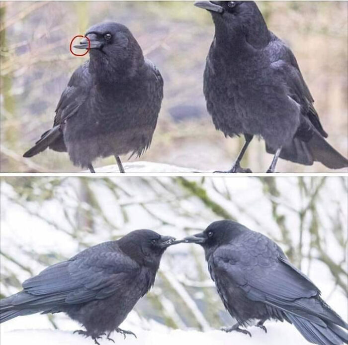 #27 This Crow Broke Her Beak 8 Years Ago In A Collision With A Car. He Has Patiently Fed Her And Loved Her Since. They Have Babies Every Year And She Is An Affectionate Mother, And The Entire Flock Protect Her. Living Proof That Compassion Is Not Limited To Humans