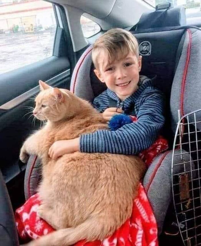 #49 Easton’s Mom Told Him He Could Adopt A New Pet. He Had The Choice Between A Puppy Dog Or A Cat. He Chose To Adopt Tiny, A 10-Year-Old Cat Who Had Just Lost His Home. Of All The Animals, He Chose To Adopt An Overweight, Old, Shy Cat. Love Is Blind, As It Should Be. On The Ride Home, Tiny Got Out Of His Cage And Cuddled In With His New Owner And Has Been Stuck To Him Ever Since. Great Job Easton, Tiny Is One Lucky Cat!