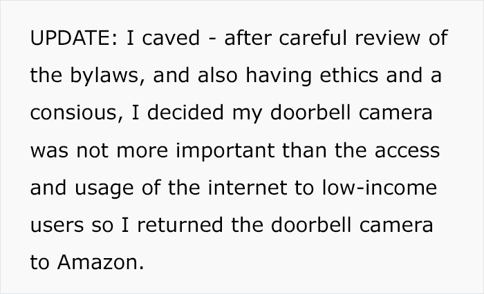 However, in an update to their post, the redditor explained that they eventually relented. “I decided my doorbell camera was not more important than the access and usage of the internet to low-income users so I returned the doorbell camera to Amazon, the company I bought the service from refunded me 80% of the cost, which I accepted because they literally could’ve told me to [eff] off but did the nice thing.”