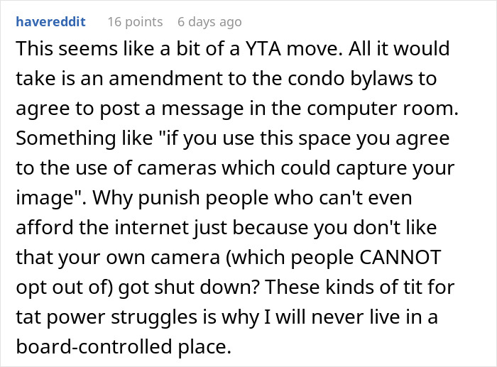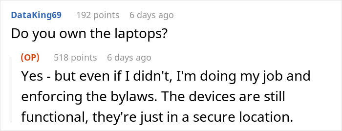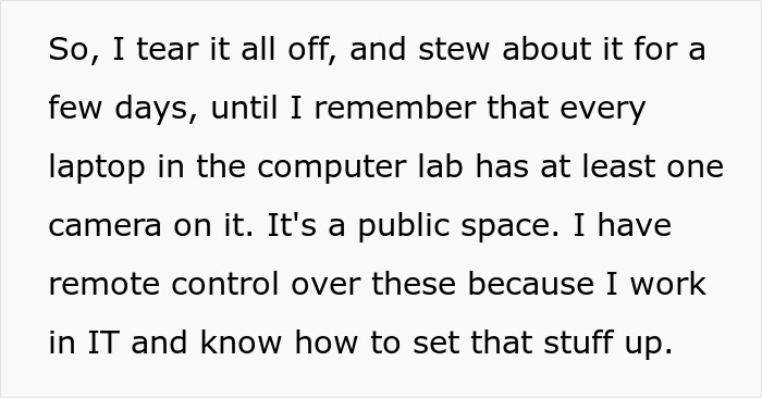 That’s where the dash of petty revenge came in. The OP then used those same bylaws to argue that the laptops in the computer room went against the same rules because they had cameras. So they remotely locked the computers and then removed them.