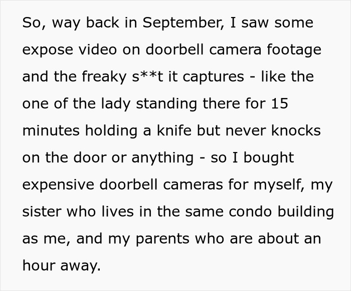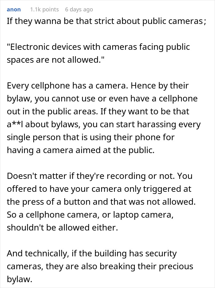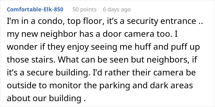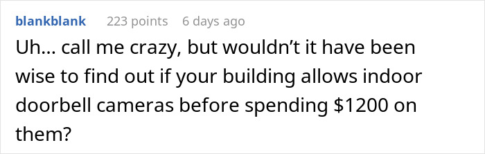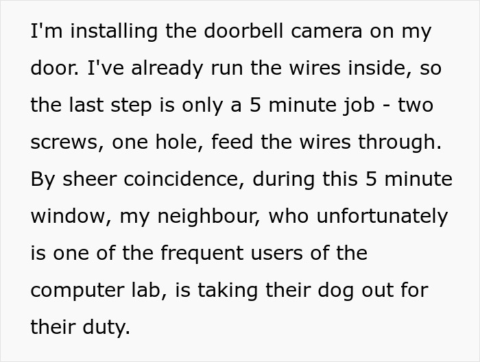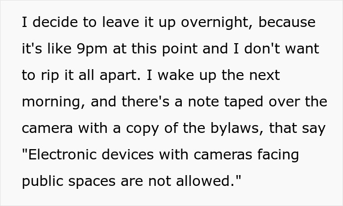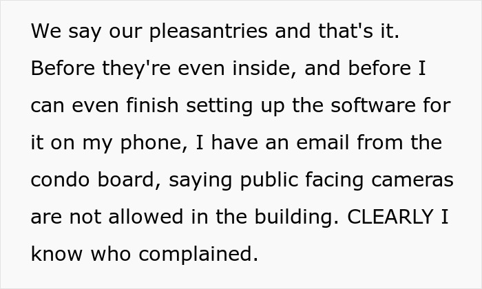 The OP explained to the r/pettyrevenge subreddit how they started worrying about their safety after watching a bunch of doorbell camera footage. So they decided to invest in a camera themselves. However, while they were installing it, one of their co-op neighbors walked by. Soon enough, the author of the post received an email from the condo board, explaining that public-facing cameras are not allowed in the building.