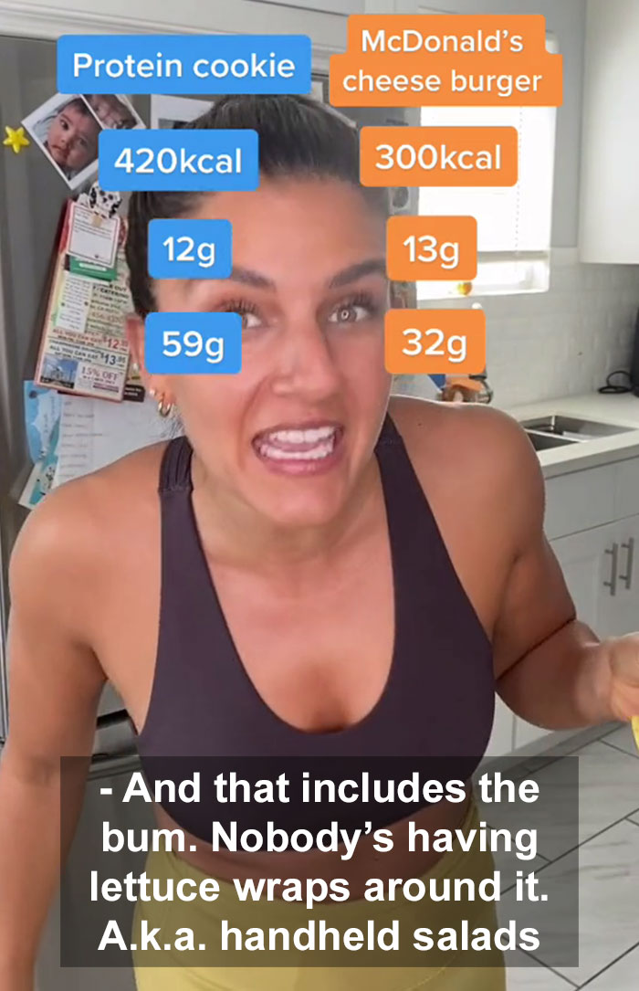 Laura Ghiacy, a personal trainer who has 367.4K followers on TikTok, compares the nutritional value of a McDonald’s cheeseburger and a protein cookie