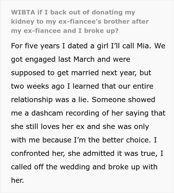 That’s what happened to one man, who turned to the AITA online community for honest advice. He shared how he was seriously considering backing out of donating his kidney to his fiancée’s brother after he learned about his partner’s true feelings for her ex. Scroll down to read the full story and an update from the author himself.