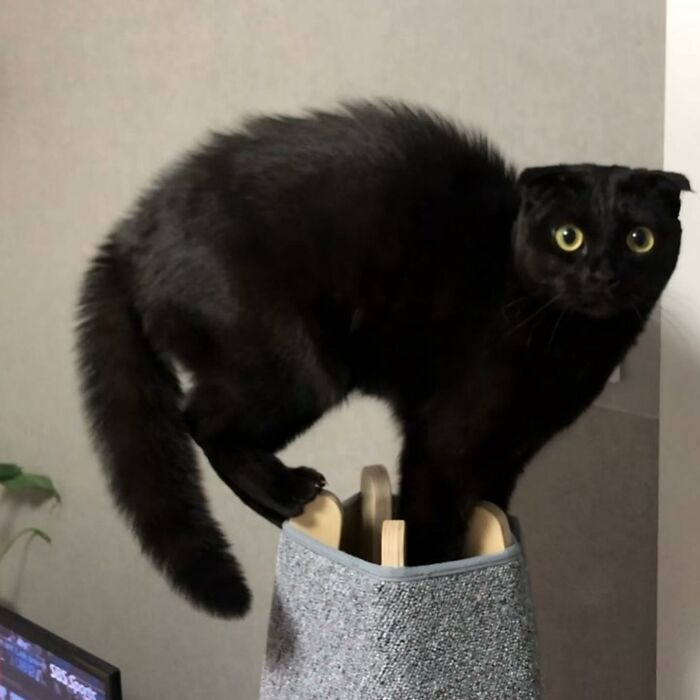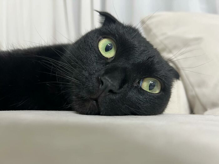 Meet MeonJi, a charming black Scottish fold cat who has captured the hearts of many with his unique appearance and captivating personality. This adorable kitty is not just another black cat—MeonJi is so dark, he almost seems to melt into the shadows. His sleek, inky fur and mesmerizing eyes make him a master of disguise, often blending perfectly with his surroundings. But don’t let his stealthy skills fool you; MeonJi is full of character and loves to show off his playful side.