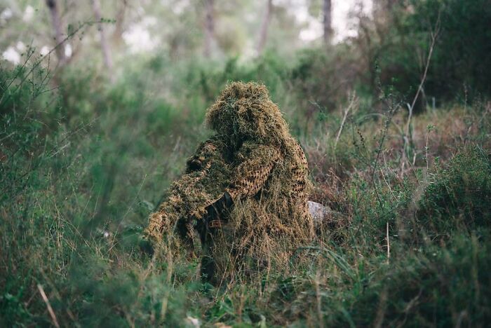 Not quite broad daylight but more like dusk. I look out my front window and see a lump on my lawn that looks out of place. I think… That really looks like a dude in a ghillie suit on my front lawn. I keep staring at it and become more and more convinced it is a dude in a ghillie suit. And I start to freak out a bit and don’t know what I am supposed to do in this situation… Like do I call the cops? Then a bunch of neighborhood kids run up to the lump and the actual factual real dude in a ghillie suit gets up. It was an older kid or a dad or something playing hide and seek in a ghillie suit.