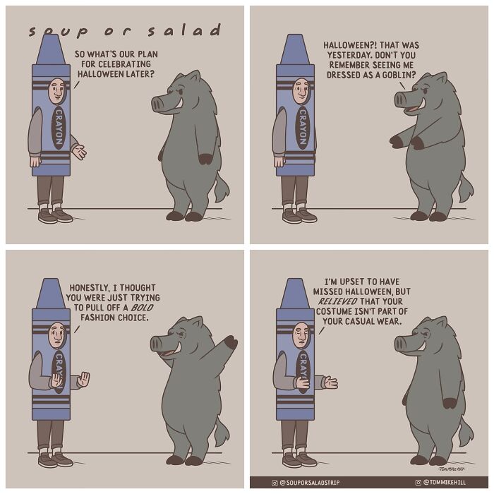 In addition to his webcomic work, Tom Mike Hill is an illustrator and designer who has worked on a variety of creative projects, including logo design, poster design, and podcast art. But for now, scroll down to dive into his hilarious “Soup or Salad” comics. We’re also excited to share an exclusive interview with Tom Mike Hill, where he discusses the inspiration behind the series, his creative process, and more!