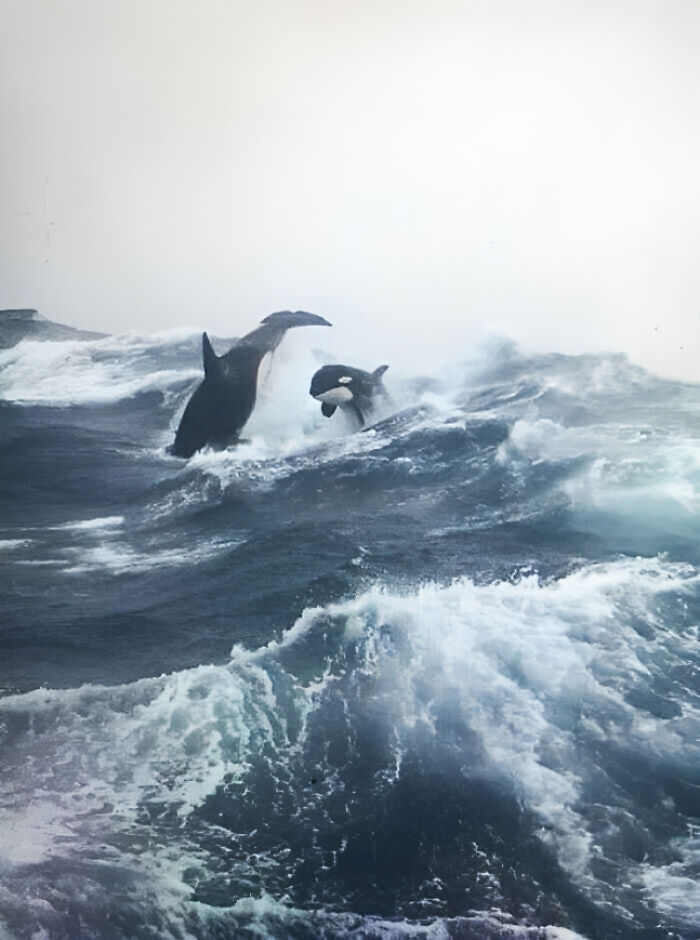 #1 Orcas Breaching In Rough Seas, Photo Taken From A Sword Fishing Boat Off The Coast Of Nova Scotia
