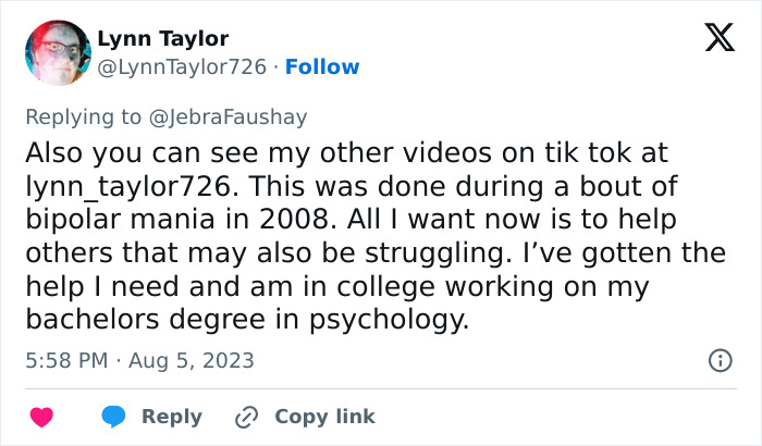 Taylor has taken to her X account (formerly known as Twitter) to clarify that she was undergoing a manic episode in 2008, the year she claims she received the facial tattoo, as a result of living with bipolar disorder.