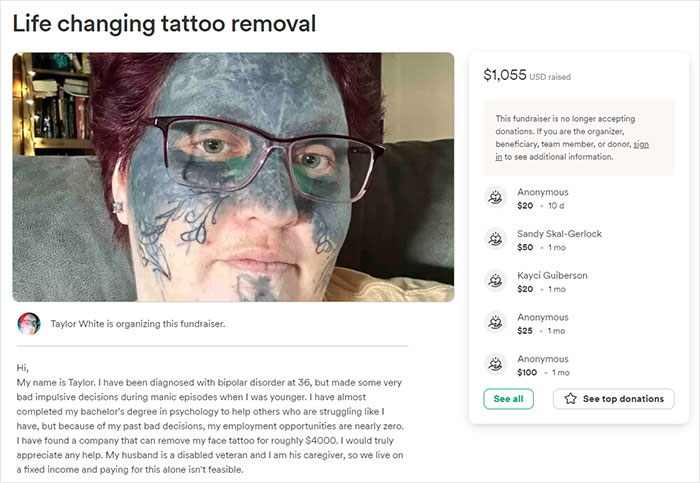 Taylor attributes her tattoos to impulsive decisions during manic episodes related to bipolar disorder, explaining her GoFundMe request for a $4,000 tattoo removal procedure, with $1,055 raised to date.