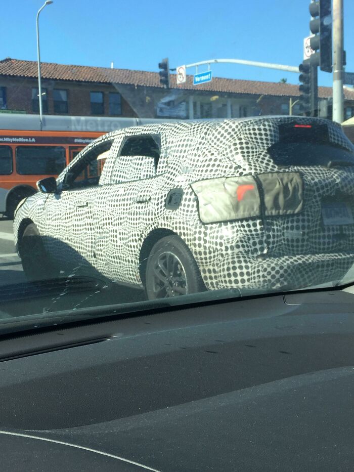 Answer: It obscures the car while being test driven, so the yet-to-be-released models are not photographed and published. The random “wave” patterns effectively hide the body contours and lines.