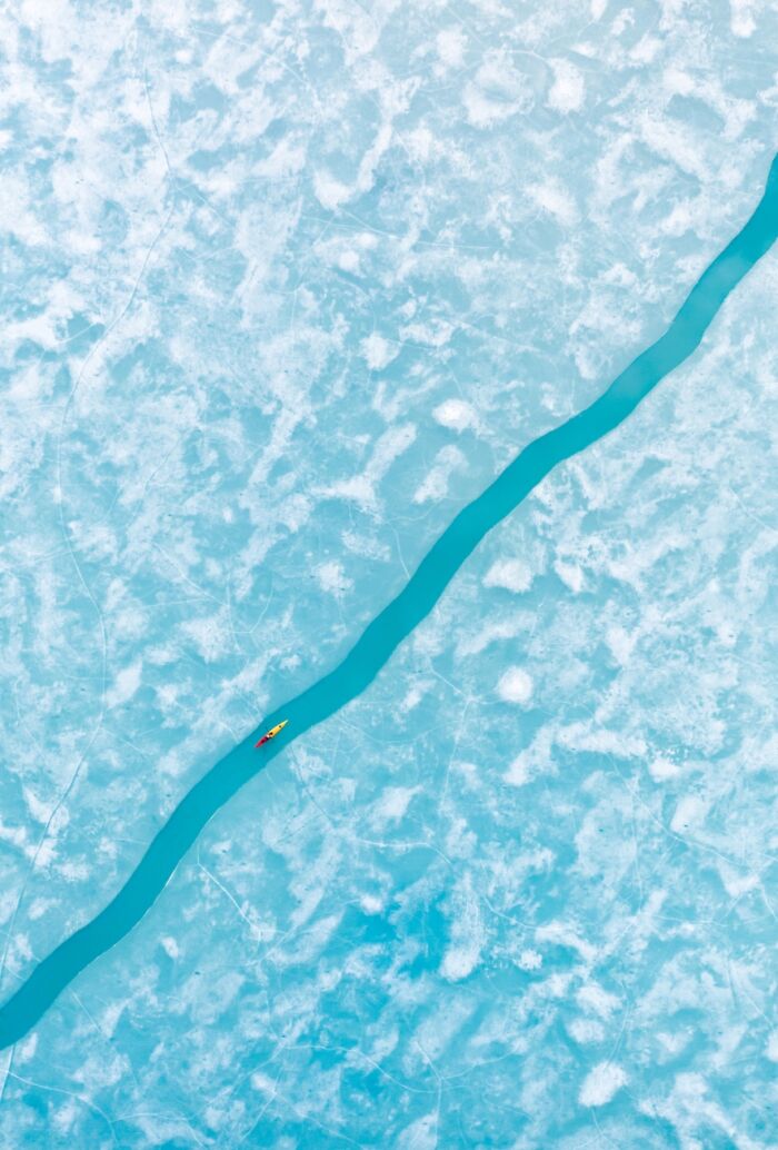 “Ice sheets drift apart on a glacial-fed lake providing a brief opportunity for exploration. With one path to continue moving forward, moving towards hope, this vast expanse of ice provides a look into the power and grandeur that nature possesses.”