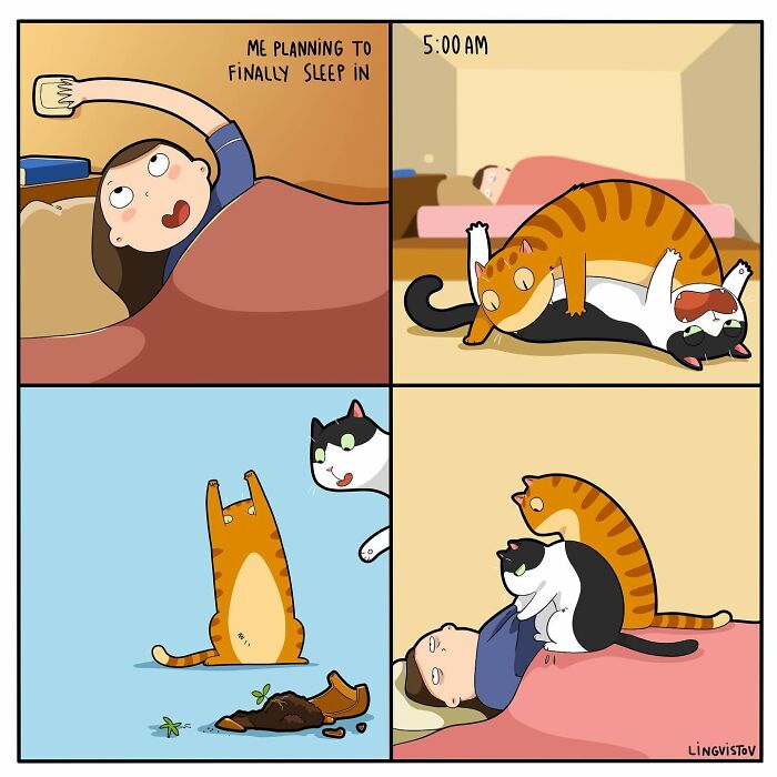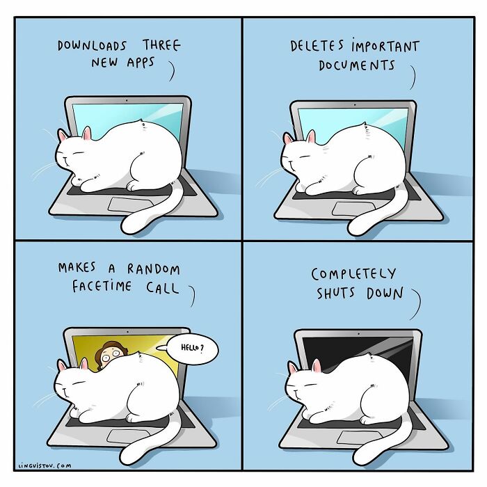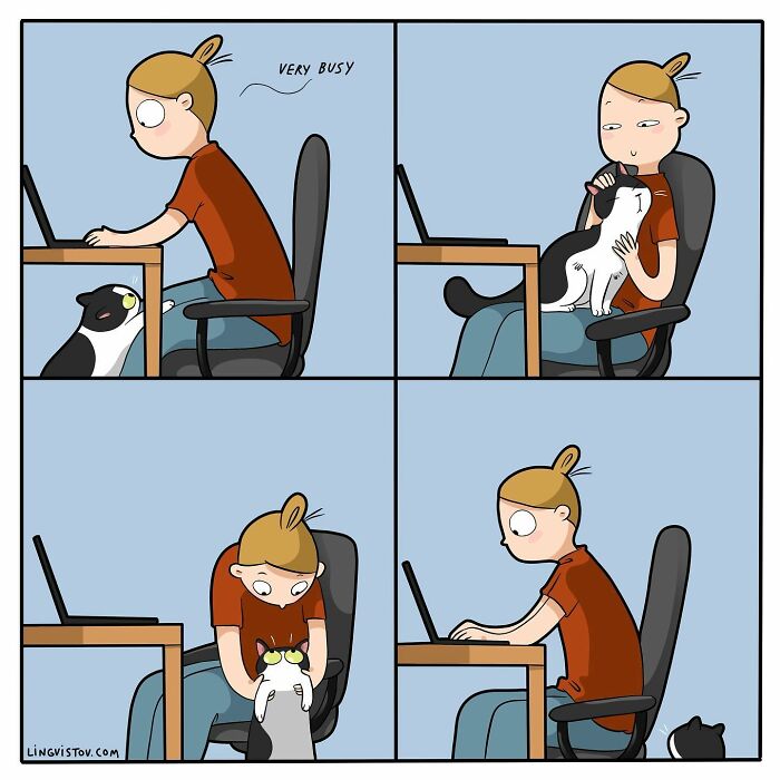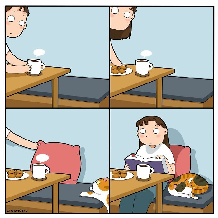 Meet Landysh, the artist who turned her lifelong cat obsession into a funny comic series that resonates with cat lovers (owners) all around the world. Despite her mom’s disapproval and a degree in linguistics instead of art, Landysh has turned her feline-fueled life into a bunch of relatable chaos and rather cozy moments.